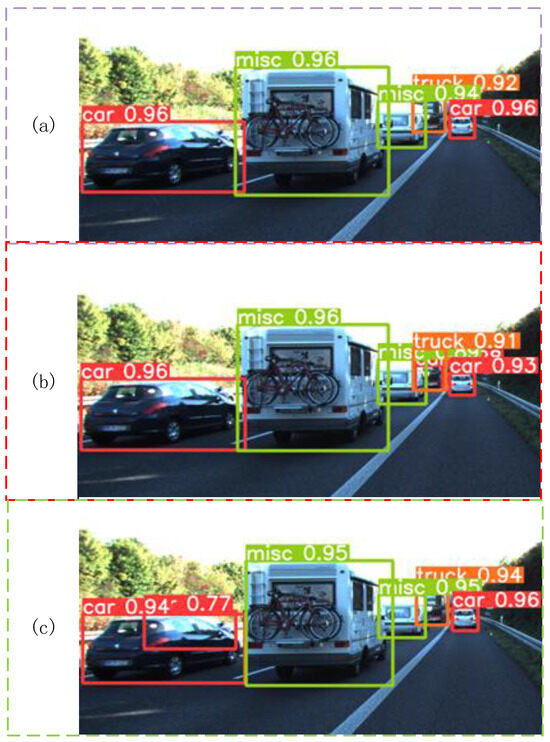 Figure 8 shows the results of the different algorithms tested on the KITTI dataset. Specifically, Figure 8a shows the detection results of YOLOv5, Figure 8b shows the Improved detection effect of YOLOv5, and Figure 8c shows the results achieved by the proposed algorithm in this paper. Through comparative analysis, we can clearly observe that no matter YOLOv5 or Improved YOLOv5, there are cases of missing or wrong detection. In contrast, our algorithm demonstrated greater accuracy in detecting vehicles. Meanwhile, it can be seen that the detection accuracy of TCE-YOLOv5 is lower than that of YOLOv5 and Improved YOLOv5 for large targets, but the detection accuracy of TCE-YOLOv5 is higher than that of YOLOv5 and Improved YOLOv5 for medium targets and small targets. This is consistent with the previous theoretical analysis and the conclusions in Table 1.