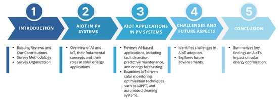 To ensure a structured and comprehensive review, this paper is organized as follows: Section 2 provides an overview of AI and IoT, explaining their fundamental concepts and roles in solar energy applications. It also highlights key enabling technologies for AIoT, including machine learning algorithms, deep learning models, IoT sensors, communication protocols, and cloud computing. Section 3 categorizes and discusses AIoT applications in solar energy, including monitoring systems, fault detection and diagnosis in PV systems, predictive maintenance, energy forecasting, and optimization techniques such as MPPT, solar tracking, and automated cleaning systems to enhance energy efficiency. Section 4 discusses the key challenges in AIoT-based solar energy systems and offers insights for future optimization of their functionality. Section 5 concludes with a summary of the key findings of this survey. Figure 2 provides a structured overview of the survey, outlining its key sections and the main topics covered.