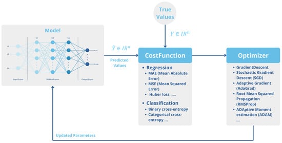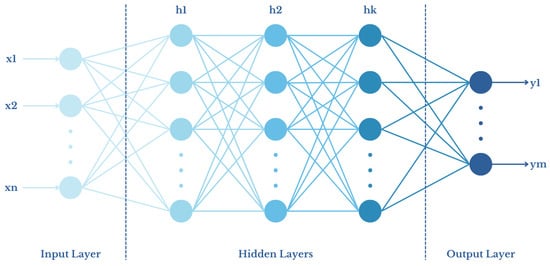 DL relies on neural networks composed of interconnected layers. These include the input layer, which receives raw data; one or more hidden layers, where computations are performed through nodes (neurons) using activation functions; and the output layer, which produces the final prediction or classification [] (see Figure 6). This layered architecture enables DL models to process complex data and extract meaningful patterns effectively.