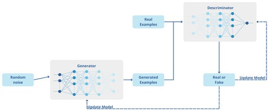 - Generative Adversarial Networks (GANs): GANs consist of two neural networks—the generator and the discriminator—that are trained simultaneously in a competitive process. The generator creates synthetic data, while the discriminator assesses its authenticity. Through this adversarial training process, the generator gradually improves its ability to produce realistic data [] (see Figure 8). GANs can be particularly useful for generating synthetic sensor data in cases where real-world datasets are limited or incomplete. This capability is especially valuable for PV fault detection and anomaly prediction, as GANs can simulate a range of fault scenarios (e.g., shading, panel degradation), enhancing the robustness of AI models.