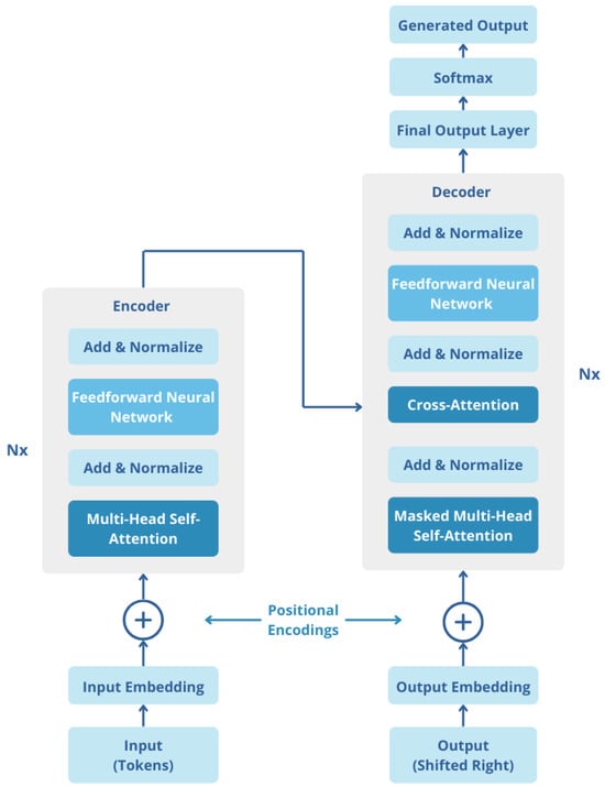 - Transformers: Transformers are a type of architecture used for natural language generation and understanding. Models like GPT (Generative Pre-trained Transformer) and BERT are based on the Transformer architecture. These models use self-attention mechanisms to capture dependencies and relationships within text, making them the backbone of large language models (LLMs) []. The Transformer architecture follows a structured workflow, as illustrated in Figure 9, where input text is first tokenized and converted into dense vector representations through an embedding layer, followed by positional encoding to incorporate order information. The encoder layers then apply multi-head self-attention mechanisms to capture relationships between tokens while processing information in parallel. The decoder layers generate output step by step using masked self-attention and cross-attention with encoder outputs, ultimately producing a probability distribution over the vocabulary through a final softmax layer to generate meaningful responses. Transformer-based models, such as LLMs, can enhance PV system monitoring through automated analysis of maintenance logs, fault reports, and operational data. By processing large volumes of text data, LLMs can assist engineers in diagnosing faults, summarizing reports, and even predicting optimal maintenance schedules.