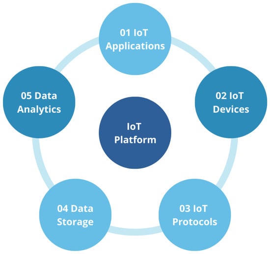 When designing IoT systems, the first step is to define the application, which refers to the use case or the problem the system will address. This is followed by selecting the appropriate components, such as sensor devices, communication protocols, data storage, and computational infrastructure. An IoT platform requires the integration of environmental sensors and suitable communication technologies to effectively achieve its objectives []. The components of an IoT platform are illustrated in Figure 10.