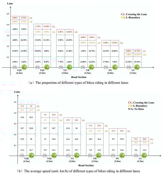 In lanes with a width of 2.5 m or less, about 15% of mechanical bicycles traveled in the L1 lane at speeds of 9–10 km/h. Fewer mechanical bicycles, about 20%, traveled in the lanes beyond the L2 lane, at speeds of around 10–11 km/h, and almost no mechanical bicycles entered the motor vehicle lane. In the case of electric bicycles, there was an increase in the number of bicycles traveling in lanes with a width of 2.5 m or less (e.g., lane L1), making up more than 15%, traveling at speeds of 13–14 km/h. The lanes beyond L2 carried a large number of electric bicycles, exceeding 40%, traveling at speeds of 15–17 km/h. In cases of lane segments with a width of 2.5 m—where electric bicycles rarely entered the motor vehicle lane—the PG and LS segments had a high proportion of bicycles entering the motor vehicle lane due to the narrow lane width.