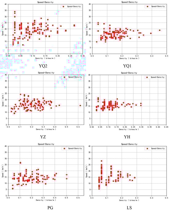 Scatter plots considering speed against the density of bicycle traffic flow.