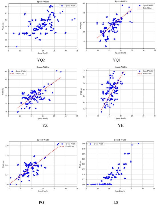 From Figure 9, it can be observed that, except for the insignificant relationship between traffic speed and width in the YQ2 and LS sections, there is a relatively clear linear relationship between them in the remaining road sections. Therefore, this paper adopts a linear regression model to construct a speed–width fitting function for these four road sections. The obtained results are presented in Table 6.