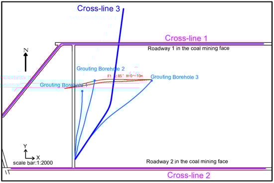 Schematic diagram of the drilling and grouting layout for faults in a coal mining face.