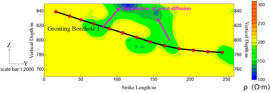 The grouting horizons of Boreholes 1, 2, and 3 are located 30 m below the tunnel. A grouting horizon plane was selected for analysis, as shown in Figure 4. Prior to grouting, the grouting horizon exhibited only minor low-resistivity anomalies near the tunnel, likely attributable to inherent differences in the formation’s electrical properties. After injecting 783 tons, 1515 tons, and 593 tons of grout into Boreholes 1, 2, and 3, respectively, post-grouting monitoring (Figure 6b) revealed a distinct Y-shaped low-resistivity anomaly near the boreholes. The injected grout, rich in free water during fracture filling, exhibited significantly lower resistivity compared to the surrounding rock. This process created interconnected conductive pathways through fracture networks, causing a rapid resistivity decline. Comparative inversion results show that the average resistivity of the grouting horizon dropped from a background value of 200 Ω·m to 180 Ω·m (approximately a 10% reduction), reflecting differential fracture development along the F1 fault. Under pressure-driven diffusion, the grout migrated preferentially along dominant fracture pathways, resulting in extensive resistivity reduction. Arrows in Figure 6b indicate high-connectivity fractures that facilitated grout propagation.