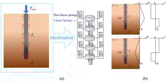 The load transfer method requires the pile body to be divided into several elastic units, and the contact between the pile side, the pile end, and the surrounding soil is replaced by nonlinear springs. Specifically, the relative displacement s of the pile-side and pile-tip resistances with respect to the surrounding soil can be represented by a load–transfer model. (He Huibin et al. [], 2008; Li Yonghui et al. [], 2011; Chen Min et al. [], 2016; SONG et al. [], 2023), as shown in Figure 1a. To simplify the calculations, the following assumptions were made: First of all, the positive direction of displacement and force is made as follows: displacement downward is positive, strain and stress direction are the same, both are positive by pressure, and the positive direction of frictional force is upward. Secondly, it is assumed that the modulus of elasticity E, thermal expansion coefficient α, and pile-soil interaction relationship are not affected by temperature. Lastly, considering that the radial dimension of the pile is much smaller than the axial dimension, the effect of temperature on the axial deformation of the pile is ignored.