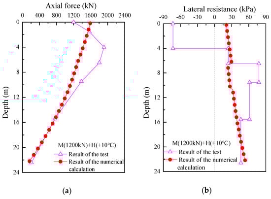 As shown in Figure 10, the results of axial force and lateral resistance distribution along the pile body obtained by the iterative algorithm of unbalanced forces at the top of the pile are more consistent with the measured results when the structural load of 840 kN is combined with heating. Similarly, the temperature change caused the change in pile-bearing performance. As can be seen from Figure 10a, heating will cause an increase in the axial force at all points of the pile, and such an effect is greatest at the top of the pile and decreases gradually with increasing depth. Figure 10b shows the distribution curve of the lateral resistance along the pile. The calculation results show that the temperature change has less effect on the upper lateral resistance of the pile; the lower lateral resistance of the pile changes more obviously by the temperature, i.e., the temperature increase causes the pile to expand, which leads to the positive resistance of the lower part of the pile making the lateral resistance of the pile increase. From the test results, it can be seen that the increase in temperature weakens the lateral resistance of the upper part of the pile, which is also caused by the expansion of the pile. Although there is a large error between the calculated value and the test value in the upper lateral resistance, it can still reflect the effect of temperature change on the pile bearing performance, so the method established in this paper is still applicable.