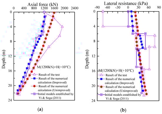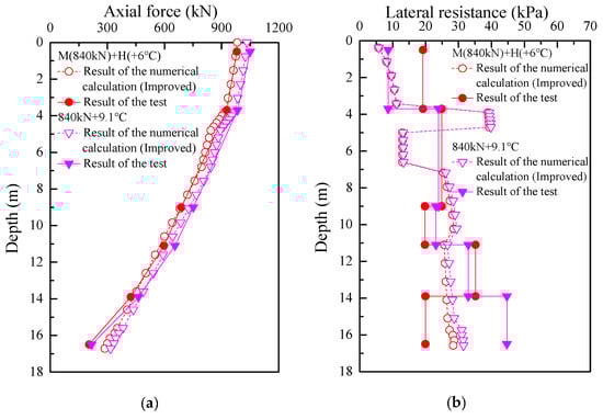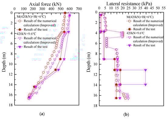 Comparison of the energy pile calculation results of the improved algorithm under different conditions with the actual test values: (a) axial force distribution along the pile; (b) the distribution of lateral resistance along the pile.