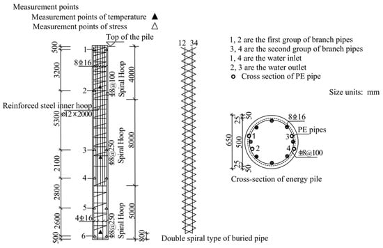 In the test, the settlement was monitored using four micrometers installed at the pile head. The load was applied to the pile using a hydraulic jack, and the magnitude of the load was measured by a load cell placed between the hydraulic jack and the pile head. The arrangement of temperature sensors and reinforcement stress gauges is shown in Figure 8, where temperature sensors are uniformly arranged at 3, 10, and 16 m below the top of the pile, while reinforcement stress gauges are installed in six groups at 0.5, 3.7, 9.0, 11.1, 13.9, and 16.5 m below the top of the pile according to the soil distribution characteristics in the site.