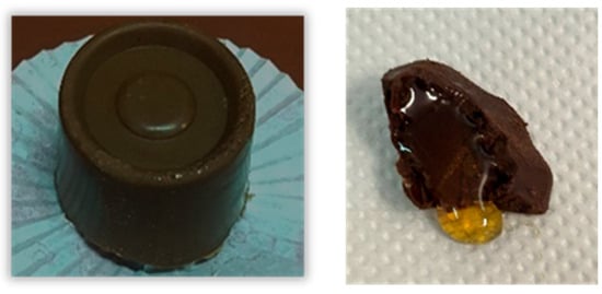 For the coating process, 40 g of couverture chocolate was melted in a water bath (60 °C) and, before the chocolate solidified, poured into 20 silicone molds (2 × 1 cm, wall thickness 1 mm). Then, after being placed in the refrigerator for about 2–3 h to solidify the chocolate, they were filled with the honey core. The flat surface of the preparation was covered with a thin layer of chocolate and placed in the refrigerator for another 3 h (Figure 1).