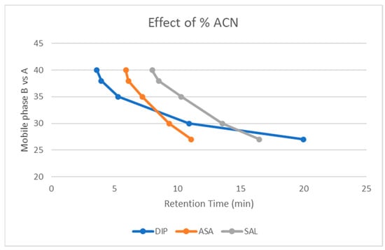 To select the optimal pH value of the mobile phase and in order to prevent hydrolysis of ACA, it had to be acidic [33]. Different acids such as formic, acetic or trifluoroacetic as well as phosphate buffers were tested. Based on the pKa values of the analytes (Table S2) [34,35,36,37,38,39,40,41,42,43,44,45] and using phosphate buffer, three pH (2.8, 3.5 and 4.25) were tested. The two APIs, which are acids (pKa(SAL) 2.98 and pKa(ACA) 3.5) at pH values higher than their pKa, are ionized and their retention time is reduced. DIP, on the other hand, as a base (pKa 3.54), at pH > pKa, due to its non-ionization, is eluted at tr > 20 min. Therefore, lower pH values were considered more appropriate since they delay the elution of the two acids and accelerate that of dipyridamole (20 mM NaH2PO4 at pH = 2.8 with phosphoric acid).