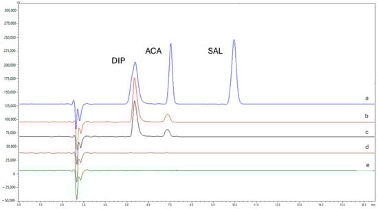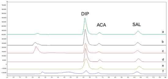 The purpose of the following investigation was to suggest a reliable analytical method that would meet the chromatographic requirements, i.e., satisfactory peak shape (Tf = 1 ± 0.2), effective separation (Rs ≥ 1.5) and short analysis time (tR < 20 min). In addition to the two APIs (ACA and DIP), special emphasis was also given to the adequate separation of salicylic acid (SAL), which is a degradation product of ACA and is considered an indicator of its hydrolysis.