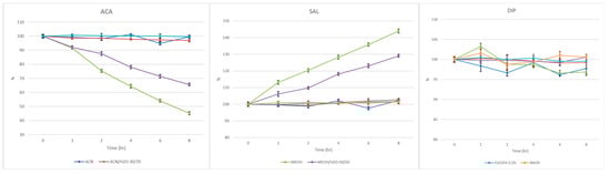 According to a recent study carried out with the aim of finding the solvent that ensures the greatest stability of ACA, acetonitrile and 1,4-dioxane were suggested, while methanol and ethanol were shown to create the greatest instability [47]. The degradation of ACA, in substituted and unsubstituted polyhydric alcohols, in contrast to its stability in acetonitrile with 1% formic acid solution, has also been recorded by other researchers [48,49]. Accordingly, in aqueous solutions, ACA exhibits stability in a mixture with polyethylene glycol, while it is largely hydrolyzed in phosphate buffer at pH 7.0 and 7.4 and a temperature of 37 °C [33]. Degradation studies have also been performed on mixtures of water with propylene glycol and triethylene glycol diacetate with ethanol, diethyl ether and diethylene glycol (at various concentrations and temperatures with or without sonication) [50,51]. Considering these reports, it was considered appropriate to conduct a further stability investigation of ACA and the two other analytes, SAL and DIP.
