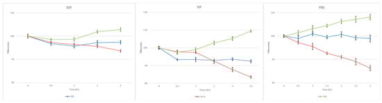 Based on the graphs depicted in Figure 6, their relative stability was higher than 80%. The greatest losses occur, as expected, at acetylsalicylic acid in SIF and PBS, as these solutions are alkaline.