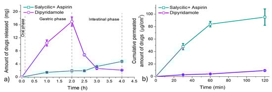 Referring to the literature data, dipyridamole is a poorly water-soluble drug, and its degree of dissolution decreases with pH increase. It is absorbed better in the small intestine [53]. On the other hand, aspirin, which is widely co-administered with dipyridamole [9], seems to be absorbed both in the intestinal epithelium (its ionized form) [54] and the stomach (non-ionized form) [55]. Of course, for its study, its significant rate of hydrolysis into salicylic acid (under alkaline conditions) should not be overlooked.