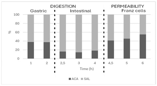 A particularly noteworthy observation in the overall release process (digestion and penetration stage) of the two active substances is related to the hydrolysis rate of ACA to SAL. According to the bar graph in Figure 8, while in the gastric phase, ACA is already hydrolyzed to a rate of >60%, this rate increases (>80%) in the intestinal tract. Then, during the study of the penetration rate of both substances, in Franz cells, approximately the same amounts of ACA and SAL were detected at the acceptor compartment (despite the low content of ACA in the intestinal tract). This leads to the conclusion that the permeation rate of ACA is much higher than that of SAL (Figure 8) and is due to their different physicochemical properties. It is noteworthy that, while both compounds show increased solubility at higher pH due to ionization, their permeation is also affected by their partition coefficients and molecular interactions with the membrane. The log p value of SAL (2.26) is higher than that of ACA (1.19), reflecting SAL’s greater lipophilicity due to its phenolic structure [66]. However, in the context of Franz diffusion cells using hydrophilic cellulose membranes, the less lipophilic ACA may achieve better partitioning and diffusion across the membrane interface, favoring its permeation.