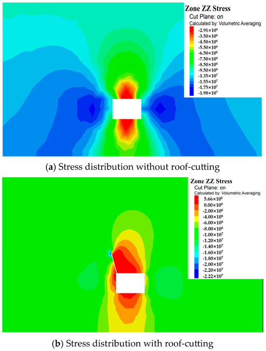 The simulation results, depicted in Figure 7, show that, without roof-cutting measures, the peak residual stress in the solid coal rib reached 19.8 MPa, with a cumulative vertical displacement of 26.5 mm. After implementing roof-cutting pressure relief, the peak residual stress reduced to 14.5 MPa, with the corresponding roof subsidence decreasing to 18.6 mm, demonstrating 26.8% stress concentration reduction and 29.8% deformation control improvement. The simulation verifies that roof cutting achieves the mechanical effects of stress redistribution and energy dissipation through reconstructing roof stress transmission paths. The fundamental mechanisms for reducing stress concentration and roof subsidence through deep-hole blasting roof cutting include the following: