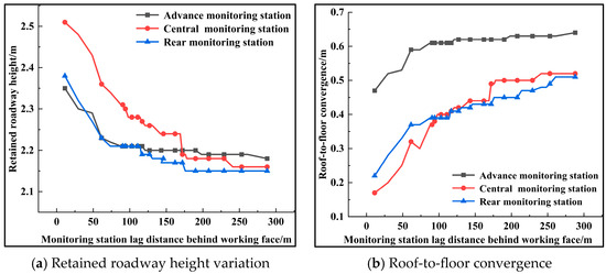 The ground pressure monitoring stations in the headgate of Panel 81308 were categorized into three groups (advance, central, and rear monitoring sections). Average values from each station group were calculated to plot the characteristic surrounding rock deformation patterns versus distance from the working face, as shown in Figure 8.