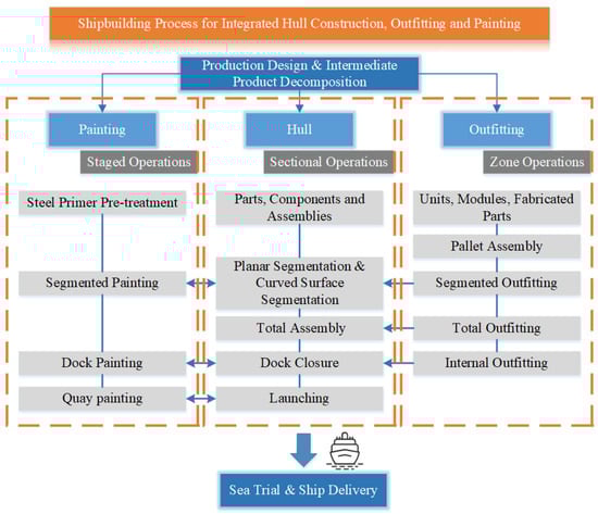 Shipbuilding process for integrated hull construction, outfitting, and painting.