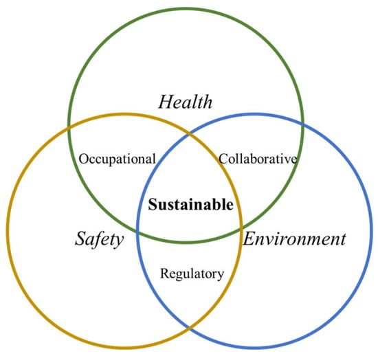 The undertaking of cruise construction is a highly intricate, tailored project that follows a regionalized building approach [,]. Figure 1 provides an illustration of the integrated shipbuilding process, encompassing hull construction, outfitting, and painting. Due to the extensive volume of parts and components involved, the logistics management requirements are exceedingly exacting []. In this context, shipyards are characterized by complex workflows, heavy machinery, hazardous materials, and a high density of simultaneous operations, which make strict HSE management indispensable. In the process of cruise construction, the production of hazardous waste materials such as waste oil, waste paint ash, waste paint slag, and waste paint barrels cannot be avoided. Among these, waste paint barrels and waste paint slag make up 90% of all hazardous waste. These materials are toxic, flammable, and infectious by nature, and fall under the category of clearly defined hazardous waste []. As such, they must be managed in strict accordance with hazardous waste regulations, and effective treatment measures must be taken to ensure that they are handed over to enterprises with hazardous waste business licenses for centralized, harmless disposal. Failure to do so in a timely manner will, from the perspective of cruise construction, occupy a significant amount of storage space, potentially causing confusion in material management and disrupting the normal production schedule. Moreover, reverse logistics in shipyards often involves the transportation and disposal of hazardous or bulky waste materials such as scrap steel, empty welding spools, and used paint containers. These processes inherently involve safety risks, potential environmental hazards, and occupational health concerns, making HSE considerations integral to reverse logistics planning. Also, HSE management principles also create sustainable development within the factory, as shown in Figure 2. Lastly, from the vantage point of green development, pollution resulting from the improper disposal of hazardous waste can impede sustainable development efforts []. Therefore, recycling hazardous wastes generated during the construction process and promoting the implementation of lean logistics management can reduce pollution and occupational safety hazards, create a favorable production environment, improve the efficiency of cruise ship construction, and ultimately achieve green safety benefits.