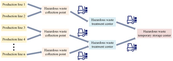 The hazardous waste recycling network within shipyards comprises a four-level network structure, encompassing production line edges, hazardous waste collection points, hazardous waste treatment centers, and hazardous waste temporary storage centers, as illustrated in Figure 4. Reverse materials, including hazardous waste and incompletely used production materials, are generated by the production line. The collection point, built in proximity to the production line, serves as a recycling facility with a specific storage capacity. The reverse materials produced by the production line are initially gathered at the collection point, resulting in a small-scale and multi-batch in-plant transportation. The reprocessing center is responsible for processing hazardous waste, including classification, redox, and compression, among other processes. The hazardous waste temporary storage center, on the other hand, is intended for storing hazardous waste during processing. Once hazardous waste materials have been treated, such as waste paint ash, waste paint sludge, and waste paint drums, they are placed in the hazardous waste temporary storage center. Once the upper limit of storage capacity is reached, a professional treatment company is invited to the plant to transport the hazardous waste to a specific environmentally friendly treatment enterprise for further processing.
