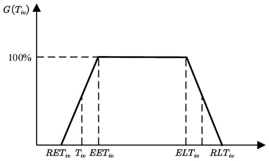 Considering that the longer the time of contact with hazardous waste materials, the higher the risk to the workers, it is stipulated that the workers should especially deal with the recovery of hazardous waste materials in a certain period of time, and give priority to the treatment of hazardous waste materials in a certain period of time. Work can also be carried out after the specified time is exceeded, but due to the increase in working hours, the time period exceeded may generate additional operational risks, and safety satisfaction will be discounted. Therefore, a fuzzy time window is proposed to reflect such a real situation, and the risk of the operator is described by the fuzzy processing method of the service time window. A safety satisfaction function is proposed, and then the risk weight is combined to describe the overall risk of the hazardous waste recycling network. The safety satisfaction function is represented by Equation (1):