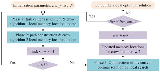 As an illustration of the aforementioned three phases, consider a scenario where there exist six hazardous waste collection points, numbered 1–6, and only two transport vehicles are available to cater to these points. In the first phase, crow search algorithm 1 is employed to allocate each task center to a specific transport vehicle. This is carried out by sequentially dividing the task centers among the vehicles, determining the transport service range of each vehicle. For instance, transport vehicle 1 is assigned to collect hazardous waste from collection points 1, 4, and 6, while transport vehicle 2 is responsible for collection points 2, 3, and 5.