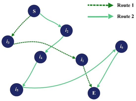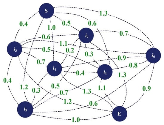 Due to restrictions on confidentiality during the construction of China’s first domestically constructed large cruise ship, the case study in this paper is based on some of the real data from the cruise shipyard, adjusted to take into account the operating conditions common to large shipyards. That is, the data used in this study come from field research and existing records in shipyards, supplemented by industry common sense to ensure representation. The approach balances the requirement for confidentiality with the need to maintain reproducibility and relevance. There are six hazardous waste collection points in the factory. One logistics center is represented by S, and one hazardous waste treatment center, denoted as E. Operators are assigned to recycle hazardous waste materials within specified time frames, maintaining optimal satisfaction levels throughout operations. Details regarding node information and vehicle-related parameters are provided in Table 3, Table 4 and Table 5 and illustrated in Figure 8.