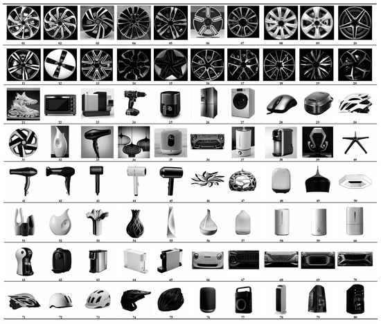 In this study, images of 20 commonly seen industrial product forms were collected from major e-commerce platforms, including Amazon, Taobao, and JD.com. The selected product categories covered consumer electronics (e.g., hair dryers, humidifiers, coffee machines, computer mice, loudspeakers), household appliances and furnishings (e.g., lamps, vases, chairs, swivel chairs with five-star bases, air fryers, rice cookers, washing machines, ovens, and refrigerators), as well as transportation equipment and other tools (e.g., wheel hubs, cars, helmets, drills, shoes, and medical devices). All collected images were converted into grayscale and underwent background standardization to minimize the influence of color, texture, and environmental noise. To ensure morphological diversity in the dataset, six senior industrial designers with over ten years of professional experience were invited to participate in the sample selection. The expert panel included four industry practitioners (e.g., design firm directors and electronic product supervisors) and two academic researchers (associate professors in industrial design). As shown in Figure 2, the experts selected 80 representative samples from the 20 product categories based on criteria including morphological diversity, market representativeness, and design innovativeness. These selected samples were later used for evaluating user preferences regarding product form.