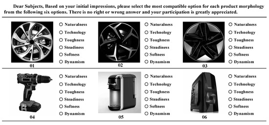 To mitigate participant fatigue and potential bias arising from information overload in the SD questionnaire, we refined the six imagery style terms (Steady, Soft, Dynamic, Tough, Technological, Natural) into more accessible sensory descriptors (Naturalness, Technology, Toughness, Steadiness, Softness, Dynamism). Each respondent selected one term to best represent their perception. The design of the questionnaire is illustrated in Figure 3.