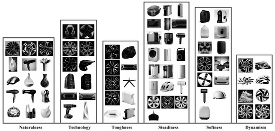 Survey 3: This offline interview involved 40 participants (20 males and 20 females). Participants showed significant similarity in their overall perception and feature classification. A total of 90% of users tended to categorize products with various morphologies into unified style categories based on their overall impression. For instance, product forms with a sense of naturalness usually featured free curves, as shown in the first column of naturalness in Figure 4; product forms with a sense of toughness were dominated by angular straight lines, as shown in the third column of toughness in Figure 4; product forms with a sense of softness had large “R” chamfers and no sharp corners, as shown in the fifth column of softness in Figure 4; product forms with a sense of dynamism were characterized by overall asymmetry, and a strong sense of visual direction and instability, as shown in the sixth column of dynamism in Figure 4. The results indicate that users consider both the overall contour lines and detailed features of products to form a consistent style perception.