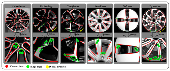 where represent contour line (l), edge transition angle (θ), visual direction (d), and visual curvature (k) of the product form. By applying this framework, designers can systematically adjust the features l, θ, d, and k to achieve the desired imagery style in alignment with user preferences.
