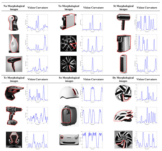 In product design, contour line (l) is used to describe the overall appearance of the product, combining key shape features such as curves, straight lines, folds, arcs, and slanted lines. It clearly defines the form and structure of the product, and the geometric features of the product can be visually conveyed through the contour line, helping the user to quickly understand its basic form. Another important feature is the edge transition angle (θ), which describes the angular characteristics of the product’s outer edges. Whether the edges are rounded or sharp directly affects the product’s visual impression and functional properties. Visual direction (d) emphasizes the product’s orientation and clarity in spatial layout. The representation of contour lines (indicated by red lines), edge transition angles (indicated by green lines), and visual directions (indicated by yellow arrows) across six imagery styles in product forms is shown in Figure 5. In the Naturalness style, the contour lines are predominantly composed of freeform curves. Edge transitions featuring large radii with an absence of sharp angles and no clear visual direction are observed. In the Technology style, the contour lines are mainly angular, comprising a mix of straight and curved segments. Edge transitions mostly consist of blunt angles, and a visual direction is present but not strongly emphasized. In the Toughness style, the contour lines are dominated by straight lines, with sharp edge transitions and a clearly defined, though not highly emphasized, visual direction. In the Steadiness style, horizontal and straight contour lines dominate. Edge transitions are characterized by small fillets or rounded corners, and obtuse angles are common. No clear visual direction is present. In the Softness style, contour lines are primarily composed of arcs. Edge transitions feature large radii and smooth curves, with no clear directionality. In the Dynamism style, contour lines combine flowing curves and diagonal lines, where edge angles are freely varied, and a strong visual direction emerges. Additionally, since complex shapes may appear ambiguous in user evaluations, visual curvature (k), an invariant feature for visual recognition of multi-scale images, is classified into high, medium, low, and zero curvature levels to improve the accuracy of product form description. Through the variations in visual curvature, product forms that are difficult to distinguish in human judgement can be distinguished more clearly, as shown in Figure 6.