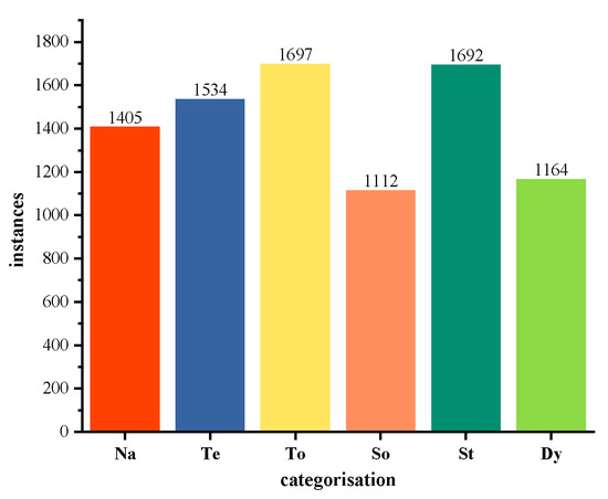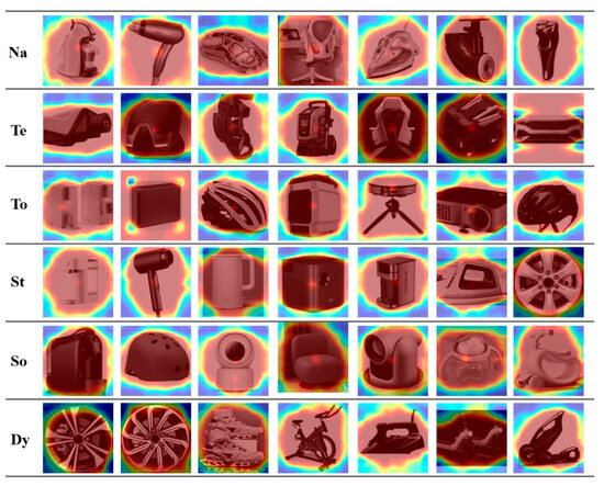 In this study, product form images were collected from 20 of the most common product categories on the market, including wheel hubs, cars, helmets, hairdryers, humidifiers, drills, lamps, vases, chairs, coffee machines, shoes, loudspeakers, swivel chairs with five-star bases, computer mice, air fryers, rice cookers, medical devices, ovens, washing machines, and refrigerators. This study focuses on the product form characteristics while excluding other factors, such as color and texture. Therefore, all collected images were converted to 640 × 640-pixel grayscale images, with prominent logos and complex backgrounds removed to minimize visual interference. To ensure the reliability of the annotation process in the NTTSSD paradigms, we randomly selected 10% of the dataset (a total of 860 images) for secondary review by four experts with over 10 years of experience in industrial product design, along with four master’s candidates specializing in industrial design. The reviewers evaluated the consistency between the style labels and the corresponding target form features. To ensure a balanced data distribution, we divided the complete annotated dataset of 8604 images into six categories, then randomly split them into training, validation, and test sets at an 8:1:1 ratio (as shown in Figure 7).