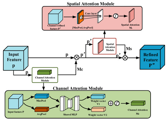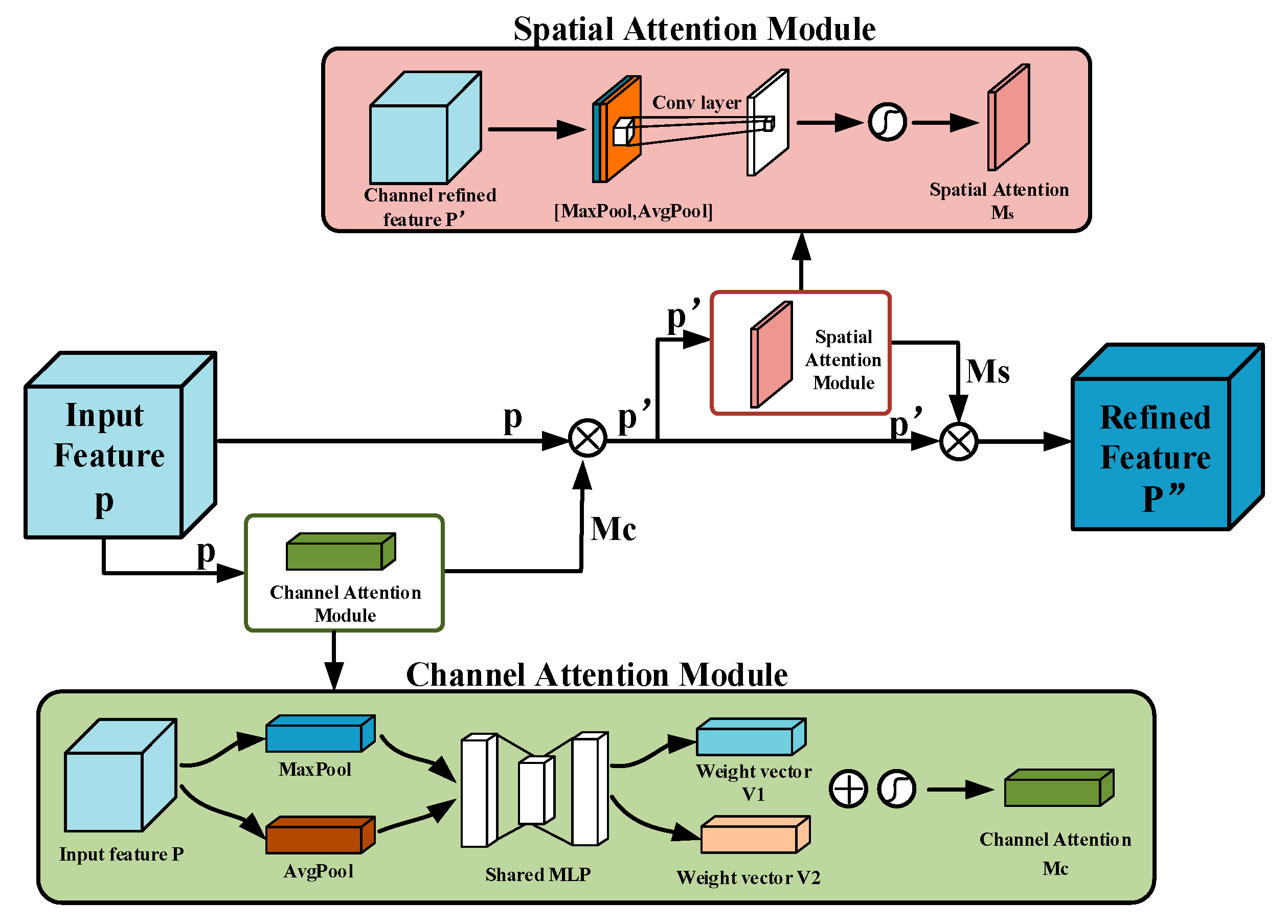 where P is the feature map, and and denote the Channel Attention Module and Spatial Attention Module. ⊗ denotes the multiplication of elements, is a sigmoid operation, denotes a convolution operation with a convolution kernel of size , and denote two convolution operations, and denote average pooling, and denote maximum pooling, and Multilayer Perceptron (MLP) represents the process of channel downgrading and then recovering.