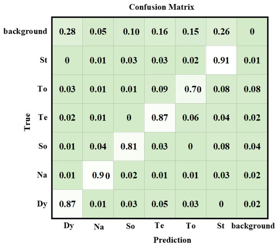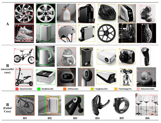 A total of 20 types of industrial product form images were used as inputs to the deep learning model and six categories of imagery style vocabularies from the NTTSSD paradigms were output. An enhanced YOLOv5 model was trained and tested to develop an Imagery Style Evaluation (ISE) method for product forms. The experiment was compiled under the Python 3.8 and PyTorch 1.8 framework on an NVIDIA GeForce GTX 1660Ti GPU. The training process involved 400 epochs with 640 × 640 pixel images and a batch size of 4. Stochastic Gradient Descent (SGD) was chosen as the optimizer, with the warmup and weight decay parameter set to 0.01 and 5 × 10−4, respectively. A confidence threshold of 0.5 was applied. The Intersection over Union (IoU) threshold was set to 0.45.