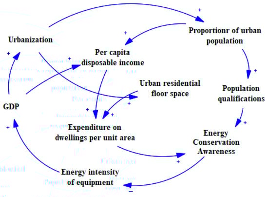 GDP is an important economic indicator, with the rapid growth of the economy signifying that the people’s discretionary income is increasing, and the conditions and demands for residential buildings are also accompanied by an increase in per capita disposable income. Improvements in the quality of service and discretionary income dually drive residents’ energy conservation awareness and their willing to buy and use energy efficient energy-saving appliances and equipment and to consciously reduce energy waste behavior, so as to reduce the operation and maintenance processes of residential buildings, more precisely the intensity of energy consumption of the equipment, to increase the GDP per capita to improve the socio-economic environment, and to improve the awareness of energy-saving behavior of residents to promote the energy-saving benefits of residential buildings. The socio-economic subsystem causal loop diagram is shown in Figure 2.