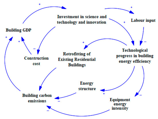 Building GDP (+) → investment in science and technology and innovation (+) → technological progress in building energy efficiency (+) → equipment energy intensity (−) → building GDP (+).