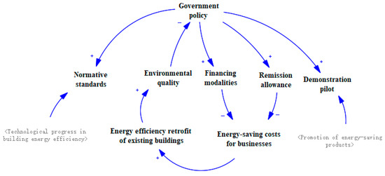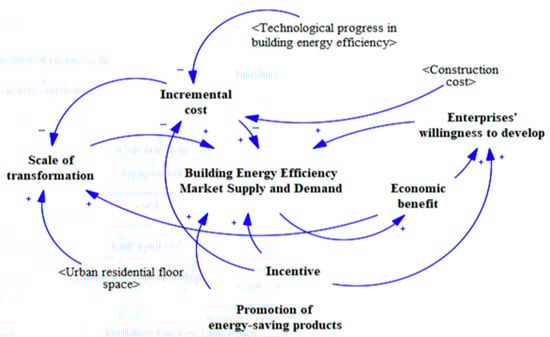 The analysis of building energy-saving transformation factors affecting the analysis found that the building energy-saving development in its early stage needs the government to guide the promulgation of policies, where the policies can be divided into incentives, norms, and standards; energy-saving products and service guides; the cultivation of human resources; and other efforts. Policy guidance for promoting the resources of the building energy efficiency industry intends to attract enterprises to participate in energy-saving project investment, to drive the development and formation of causal loop relationships (Figure 4).