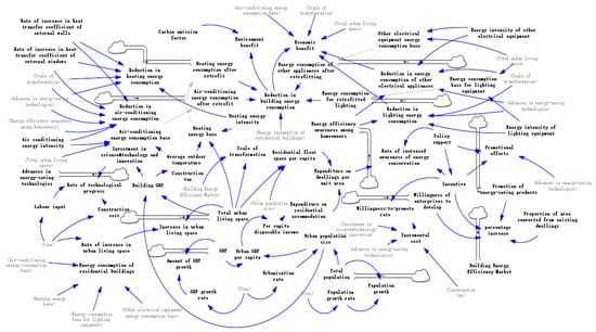 Most of the above studies have examined the benefit value of project cases from a micro perspective, and the comprehensive performance of the urban-scale retrofitting is yet to be explored from the macro perspective, where multiple factors affect the energy efficiency of the construction industry in a comprehensive manner. System dynamics can reflect the complexity of the energy efficiency retrofit process in residential buildings. It can clearly reflect the composition of the internal elements of the system, by connecting the various subsystems, showing the corresponding positive and negative feedback cause and effect relationships that make the system form a holistic framework, and system dynamics can reflect the complex logic of the subsystems in the process of energy-saving renovation of residential buildings’ feedback relationship between the various subsystems as well as the relationship between the subsystems. System dynamics can be used for predicting carbon emissions [26,27], assembling industrial policy simulations [28], and public building energy saving path [29] by determining feedback loops to decipher the causal relationships and clarify the influencing factors of the complex system, and it can also be used for dynamic simulation.
