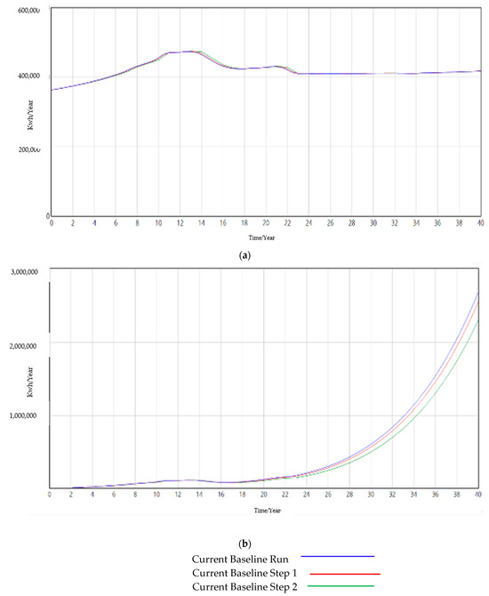 (1) Stability testing is a study to assess whether a dynamic system can return to its initial state or reach a new equilibrium state after a disturbance. In this study, the stability of the simulation system structure is examined by setting different system simulation steps or time intervals. By selecting the two factors of “energy consumption of urban residential buildings” and “reduction in building energy consumption” for the stability test, the proposed modeling step “TIME STEP” is set as 1 year, 0.5 year, and 0.25 year, respectively. The proposed modeling step “TIME STEP” is set to 1 year, 0.5 year, and 0.25 year, and the corresponding scenarios are named as “Current Baseline Run”, “Current Step 1”, and “Current Step 2”, respectively. The results are shown in Figure 7. Under the three different step-size scenarios, the simulation trend of each indicator is basically the same, which indicates that the system is not sensitive to the change in the step-size, and the constructed model is stable.