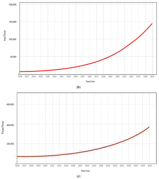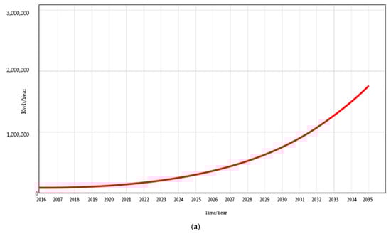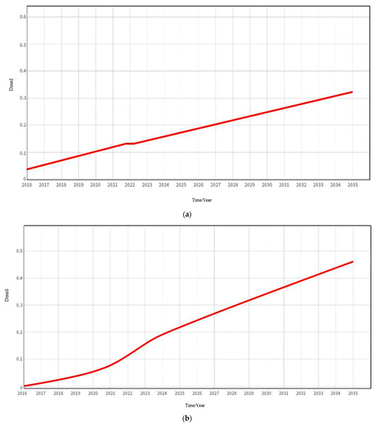 As per Figure 9a, the rate of increase in the willingness level of enterprises to participate in the development of building energy-saving renovation projects is affected by the strength of energy-saving technology research and development, incremental revenue generated by renovation projects, policy support, and incentive mechanisms. According to the figure, the rate of increase in the willingness level is a phased increase, due to the phased increase in the proportion of scientific and technological innovation inputs over time, which is initially set in the model.