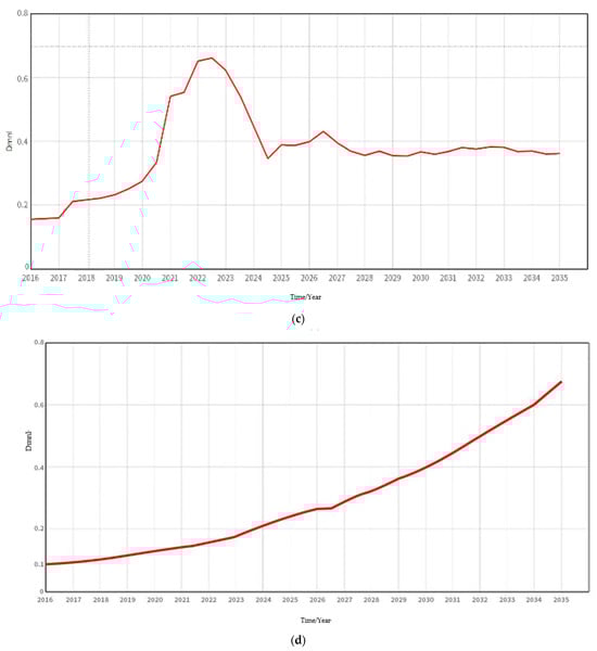 Results of the baseline scenario impact factor run: (a) willingness rate of enterprises to develop; (b) efforts to promote energy-saving products; (c) policy support rate; (d) energy efficiency technology progress rate.