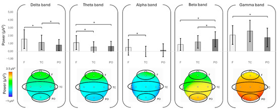 Bar graphs of EEG bands (delta, theta, alpha, beta, and gamma) for each ROI (F = frontal, TC = temporo-central, PO = parieto-occipital). The second row shows topographic maps of the average power in the five EEG frequency bands, highlighting the spatial distribution of EEG activity across the ROIs. The color scale represents the relative intensity of EEG power (blue = low power, red = high power). Bars represent ±1 standard error, and stars (*) mark statistically significant effects.