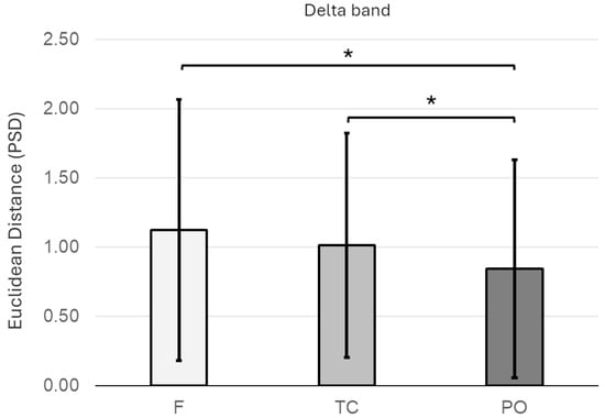 The bar chart shows the Euclidean Distance between the power spectral density (PSD) values across the three ROIs (F = frontal, TC = temporo-central, PO = parieto-occipital). Bars represent ±1 standard error and stars (*) mark statistically significant effects.