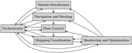 Figure 4 illustrates the communication flow and functional dependencies among the intelligent agents defined in the proposed MAS architecture. The orchestrator agent acts as the central coordinator, receiving and distributing information to all other agents. Vehicle distribution, navigation, and routing agents interact closely to define optimal parking locations and internal routes. Flow control manages congestion based on routing outputs and relays restrictions to shipping aoordination, which schedules boarding accordingly. Monitoring and optimization collects performance indicators from all agents and provides system-level feedback to both the orchestrator and other agents, enabling adaptive behavior. The diagram highlights not only bilateral communication but also vertical dependencies, where decisions by downstream agents depend on the orchestration and data consolidation performed at higher levels. This structure enables scalable coordination across operational layers of a Ro-Ro terminal.