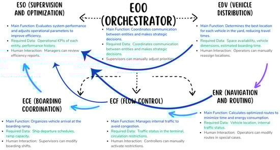 The design of the multi-agent system (MAS) is based on the integration of various intelligent entities, each of them responsible for managing a specific aspect of the port operation (Table 1). These entities work in a coordinated manner to optimize efficiency and decision-making within the port environment, ensuring more dynamic and automated management. The main intelligent entities of the system are presented below, along with their respective functions, the data they require for their operation, and the level of interaction they maintain with users.