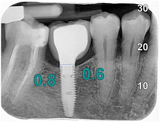 Image processing was performed using Digora Optime software (Soredex, Tuusula, Finland), using the dedicated measurement tool. To ensure an accurate assessment of bone loss, an image calibration was first performed, using the known implant diameter as the reference unit (pixels/mm).